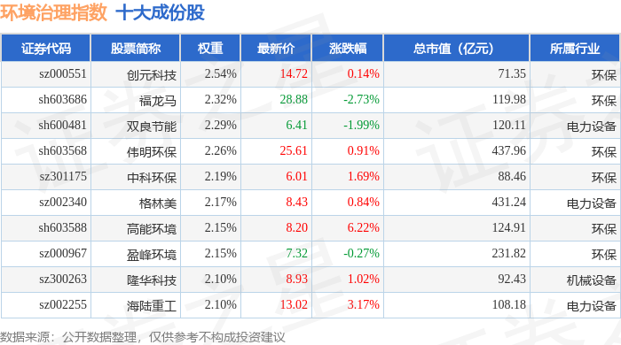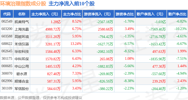 资金流向方面,环境治理(399806)指数成份股当日主力资金净流出合计6.49亿元,游资资金净流出合计9539.13万元,散户资金净流入合计7.44亿元。成份股资金流向详情见下表: