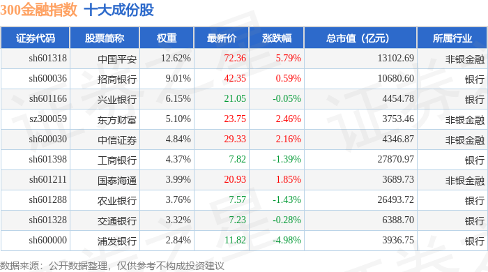 300金融(399914)指数十大成份股详情如下: