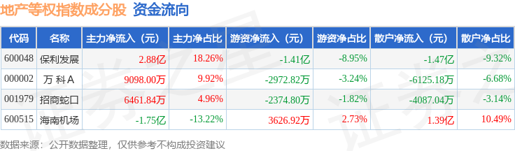 资金流向方面,地产等权(399983)指数成份股当日主力资金净流入合计2.69亿元,游资资金净流出合计1.59亿元,散户资金净流出合计1.1亿元。成份股资金流向详情见下表: