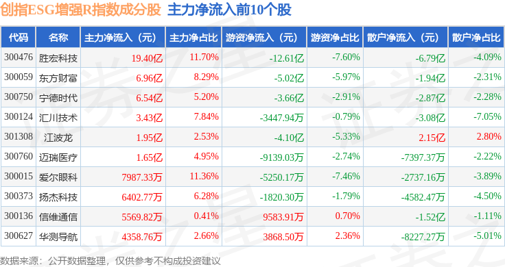 资金流向方面,创指ESG增强R(470034)指数成份股当日主力资金净流入合计3804.44万元,游资资金净流出合计7.61亿元,散户资金净流入合计7.23亿元。成份股资金流向详情见下表:
