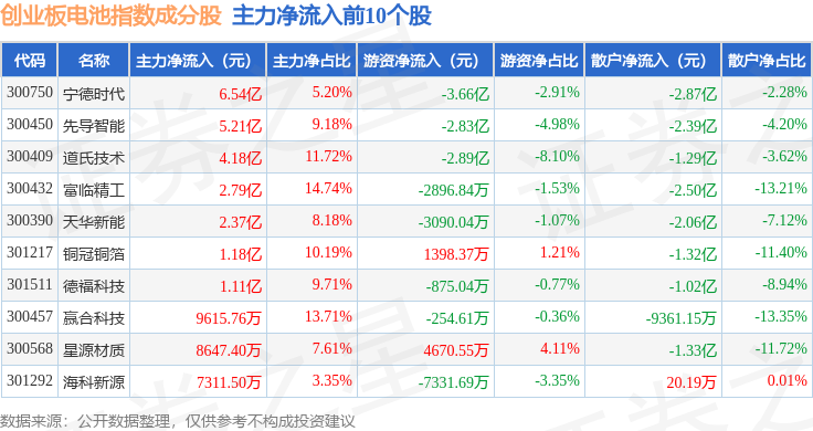 资金流向方面,创业板电池(970081)指数成份股当日主力资金净流入合计19.4亿元,游资资金净流出合计12.07亿元,散户资金净流出合计7.32亿元。成份股资金流向详情见下表: