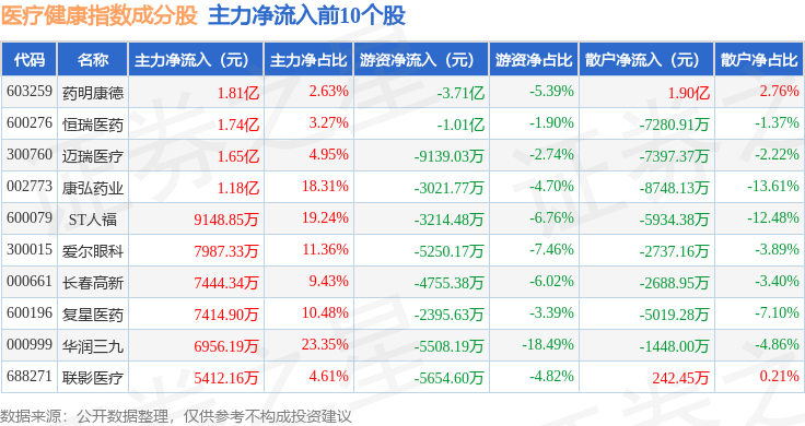 资金流向方面,医疗健康(980016)指数成份股当日主力资金净流入合计9.47亿元,游资资金净流出合计11.15亿元,散户资金净流入合计1.68亿元。成份股资金流向详情见下表: