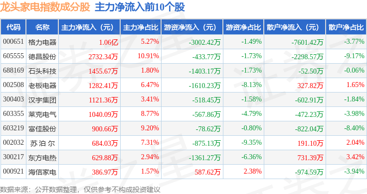 龙头家电(980028)指数十大成份股详情如下: