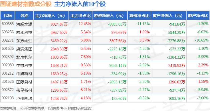资金流向方面,国证建材(980048)指数成份股当日主力资金净流出合计3442.28万元,游资资金净流出合计2.14亿元,散户资金净流入合计2.49亿元。成份股资金流向详情见下表: