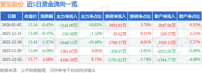 1月5日的资金流向数据方面,主力资金净流出3141.0万元,占总成交额10.62%,游资资金净流入1093.93万元,占总成交额3.7%,散户资金净流入2047.06万元,占总成交额6.92%。