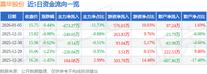 证券之星消息,截至2026年1月5日收盘,嘉华股份(603182)报收于15.75元,下跌0.44%,换手率2.22%,成交量3.65万手,成交额5740.33万元。