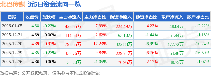证券之星消息,截至2026年1月5日收盘,北巴传媒(600386)报收于4.38元,下跌0.23%,换手率1.5%,成交量12.12万手,成交额5302.51万元。