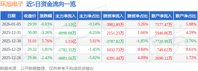 证券之星消息,截至2026年1月5日收盘,环旭电子(601231)报收于29.99元,下跌0.03%,换手率1.8%,成交量40.41万手,成交额12.22亿元。
