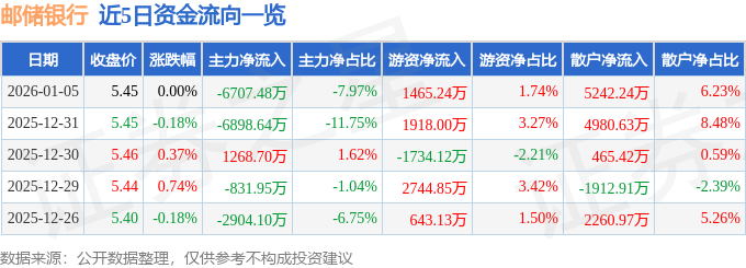 证券之星消息,截至2026年1月5日收盘,邮储银行(601658)报收于5.45元,上涨0.0%,换手率0.23%,成交量154.6万手,成交额8.41亿元。