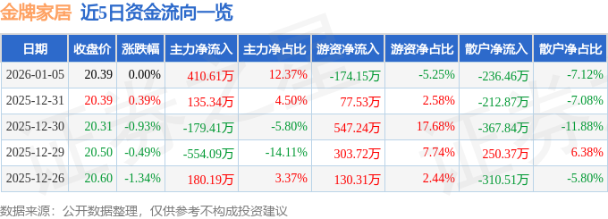 证券之星消息,截至2026年1月5日收盘,金牌家居(603180)报收于20.39元,上涨0.0%,换手率1.06%,成交量1.63万手,成交额3319.65万元。