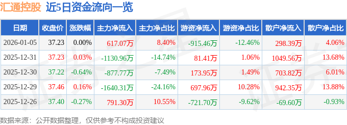 证券之星消息,截至2026年1月5日收盘,汇通控股(603409)报收于37.23元,上涨0.0%,换手率6.25%,成交量1.97万手,成交额7348.82万元。