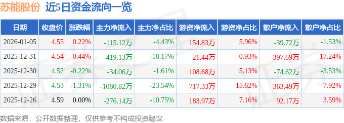 证券之星消息,截至2026年1月5日收盘,苏能股份(600925)报收于4.55元,上涨0.22%,换手率0.36%,成交量5.71万手,成交额2598.4万元。