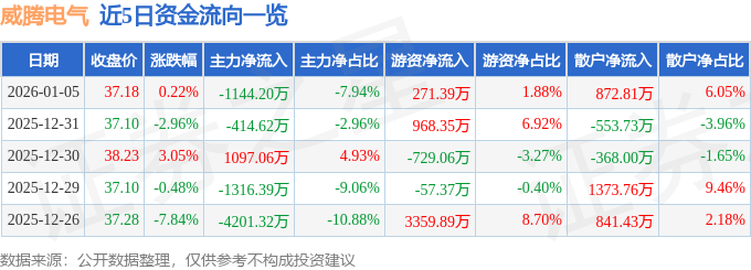 证券之星消息,截至2026年1月5日收盘,威腾电气(688226)报收于37.18元,上涨0.22%,换手率2.05%,成交量3.86万手,成交额1.44亿元。