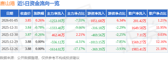 证券之星消息,截至2026年1月5日收盘,唐山港(601000)报收于3.85元,上涨0.26%,换手率0.73%,成交量43.22万手,成交额1.66亿元。