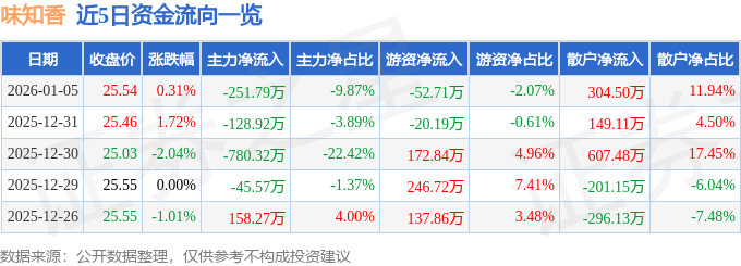 证券之星消息,截至2026年1月5日收盘,味知香(605089)报收于25.54元,上涨0.31%,换手率0.72%,成交量9998.0手,成交额2550.43万元。