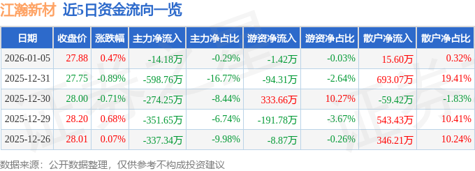 1月5日的资金流向数据方面,主力资金净流出14.18万元,占总成交额0.29%,游资资金净流出1.42万元,占总成交额0.03%,散户资金净流入15.6万元,占总成交额0.32%。