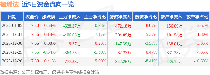 1月5日的资金流向数据方面,主力资金净流出628.27万元,占总成交额10.73%,游资资金净流入472.18万元,占总成交额8.07%,散户资金净流入156.09万元,占总成交额2.67%。