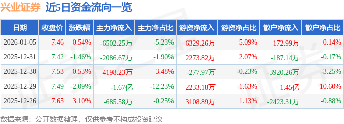 证券之星消息,截至2026年1月5日收盘,兴业证券(601377)报收于7.46元,上涨0.54%,换手率1.93%,成交量166.79万手,成交额12.44亿元。