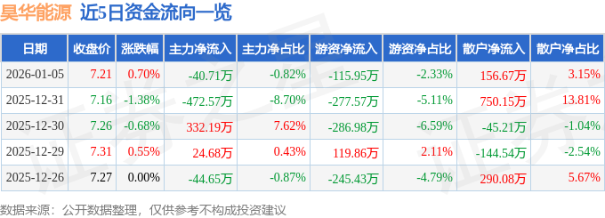 证券之星消息,截至2026年1月5日收盘,昊华能源(601101)报收于7.21元,上涨0.7%,换手率0.48%,成交量6.89万手,成交额4969.09万元。