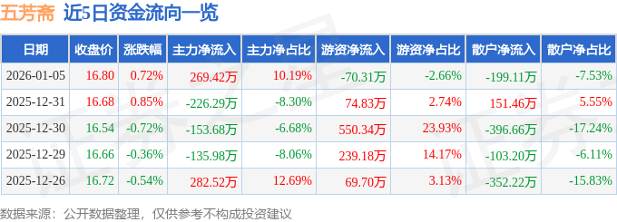 1月5日的资金流向数据方面,主力资金净流入269.42万元,占总成交额10.19%,游资资金净流出70.31万元,占总成交额2.66%,散户资金净流出199.11万元,占总成交额7.53%。