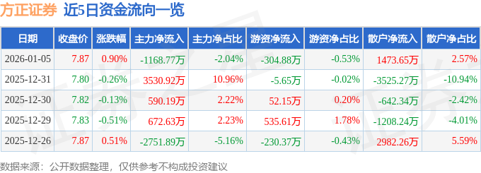 证券之星消息,截至2026年1月5日收盘,方正证券(601901)报收于7.87元,上涨0.9%,换手率0.89%,成交量73.11万手,成交额5.73亿元。