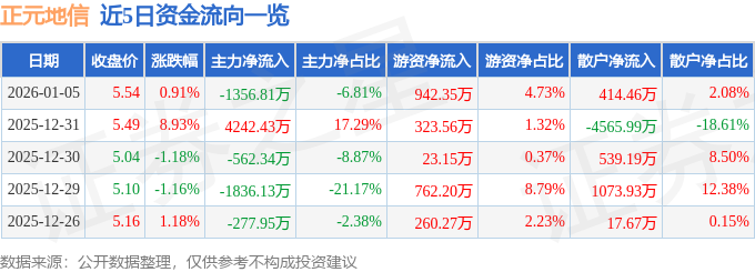 1月5日的资金流向数据方面,主力资金净流出1356.81万元,占总成交额6.81%,游资资金净流入942.35万元,占总成交额4.73%,散户资金净流入414.46万元,占总成交额2.08%。