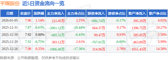 证券之星消息,截至2026年1月5日收盘,平煤股份(601666)报收于7.96元,上涨1.14%,换手率0.5%,成交量12.39万手,成交额9833.8万元。