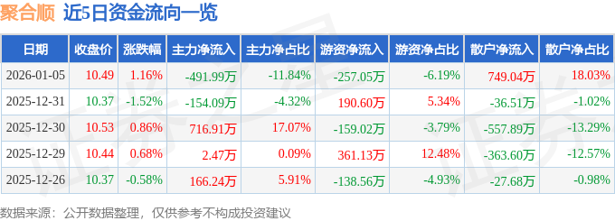 证券之星消息,截至2026年1月5日收盘,聚合顺(605166)报收于10.49元,上涨1.16%,换手率1.26%,成交量3.95万手,成交额4154.06万元。