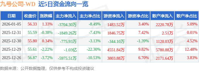 证券之星消息,截至2026年1月5日收盘,九号公司(689009)报收于56.33元,上涨1.33%,换手率1.41%,成交量7.82万手,成交额4.36亿元。
