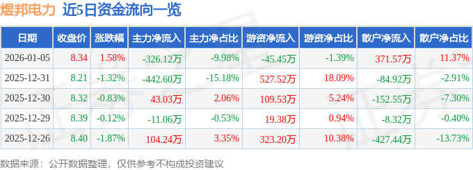 1月5日的资金流向数据方面,主力资金净流出326.12万元,占总成交额9.98%,游资资金净流出45.45万元,占总成交额1.39%,散户资金净流入371.57万元,占总成交额11.37%。