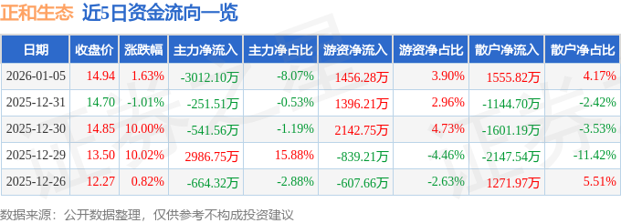 证券之星消息,截至2026年1月5日收盘,正和生态(605069)报收于14.94元,上涨1.63%,换手率29.55%,成交量24.87万手,成交额3.73亿元。