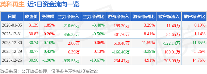 证券之星消息,截至2026年1月5日收盘,英科再生(688087)报收于31.39元,上涨1.85%,换手率1.04%,成交量1.93万手,成交额6045.62万元。