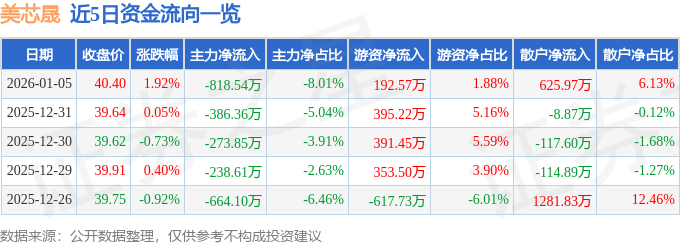 证券之星消息,截至2026年1月5日收盘,美芯晟(688458)报收于40.4元,上涨1.92%,换手率2.97%,成交量2.53万手,成交额1.02亿元。