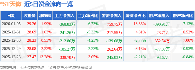 证券之星消息,截至2026年1月5日收盘,*ST天微(688511)报收于29.26元,上涨1.99%,换手率1.83%,成交量1.88万手,成交额5481.04万元。