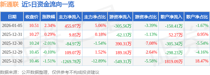 证券之星消息,截至2026年1月5日收盘,新通联(603022)报收于10.51元,上涨2.34%,换手率4.32%,成交量8.65万手,成交额9018.99万元。