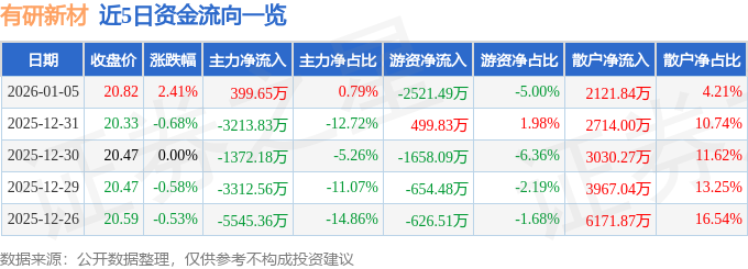 1月5日的资金流向数据方面,主力资金净流入399.65万元,占总成交额0.79%,游资资金净流出2521.49万元,占总成交额5.0%,散户资金净流入2121.84万元,占总成交额4.21%。