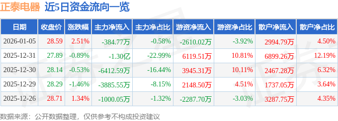 1月5日的资金流向数据方面,主力资金净流出384.77万元,占总成交额0.58%,游资资金净流出2610.02万元,占总成交额3.92%,散户资金净流入2994.79万元,占总成交额4.5%。