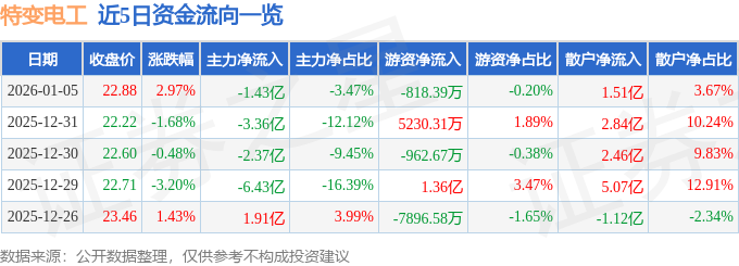 证券之星消息,截至2026年1月5日收盘,特变电工(600089)报收于22.88元,上涨2.97%,换手率3.54%,成交量179.12万手,成交额41.17亿元。