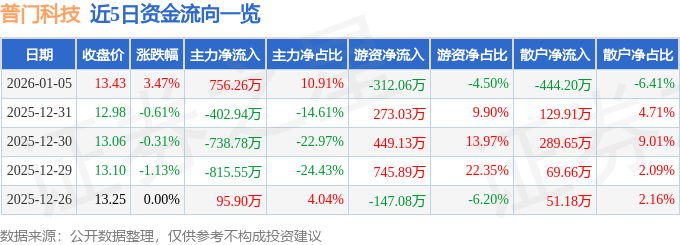 1月5日的资金流向数据方面,主力资金净流入756.26万元,占总成交额10.91%,游资资金净流出312.06万元,占总成交额4.5%,散户资金净流出444.2万元,占总成交额6.41%。