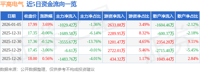 证券之星消息,截至2026年1月5日收盘,平高电气(600312)报收于17.99元,上涨3.69%,换手率3.09%,成交量41.9万手,成交额7.56亿元。