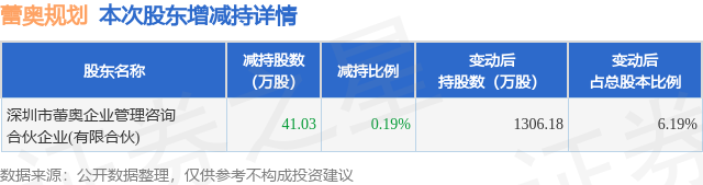 证券之星消息,1月5日蕾奥规划发布公告《蕾奥规划:关于股东股份减持计划实施完成的公告》,其股东深圳市蕾奥企业管理咨询合伙企业(有限合伙)于2025年12月27日至2025年12月31日间合计减持41.03万股,占公司目前总股本的0.1945%,变动期间该股股价下跌0.84%,截止12月31日收盘报17.65元。