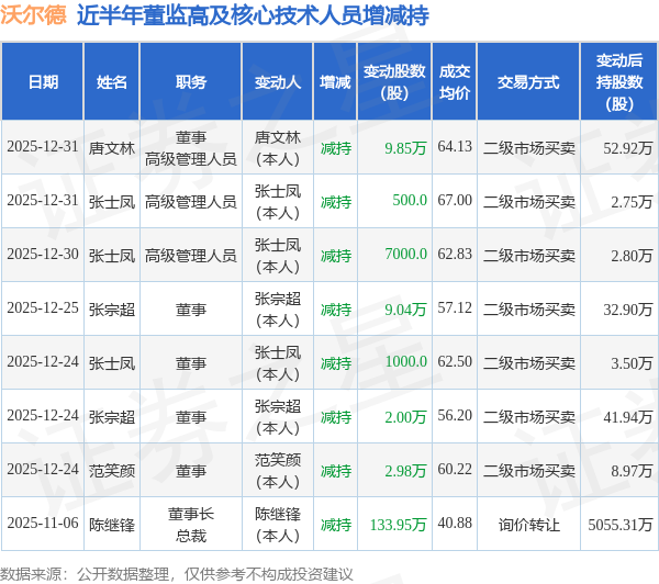 沃尔德近半年内的董监高及核心技术人员增减持详情如下: