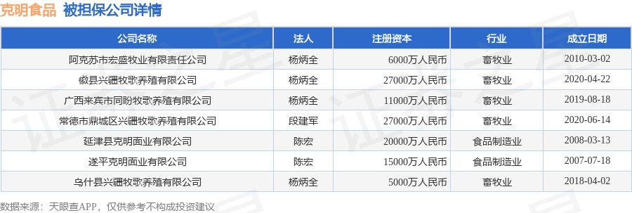 克明食品1月4日披露7笔对外担保,被担保公司7家。对外担保明细如下表: