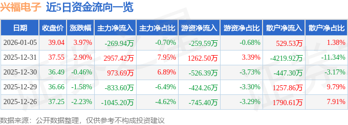 1月5日的资金流向数据方面,主力资金净流出269.94万元,占总成交额0.7%,游资资金净流出259.59万元,占总成交额0.68%,散户资金净流入529.53万元,占总成交额1.38%。