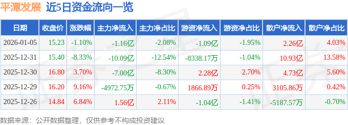 证券之星消息,截至2026年1月5日收盘,平潭发展(000592)报收于15.23元,下跌1.1%,换手率18.93%,成交量362.51万手,成交额55.96亿元。