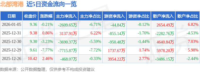 证券之星消息,截至2026年1月5日收盘,北部湾港(000582)报收于9.36元,下跌0.21%,换手率2.07%,成交量41.67万手,成交额3.89亿元。