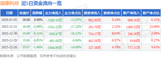 证券之星消息,截至2026年1月5日收盘,瑞泰科技(002066)报收于18.68元,上涨0.0%,换手率2.25%,成交量5.19万手,成交额9660.19万元。