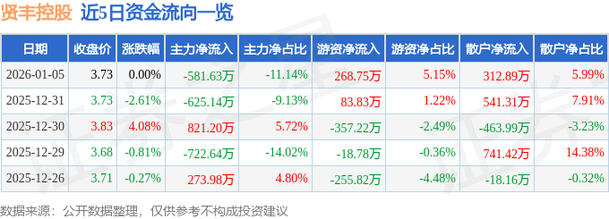 证券之星消息,截至2026年1月5日收盘,贤丰控股(002141)报收于3.73元,上涨0.0%,换手率1.38%,成交量14.01万手,成交额5220.08万元。