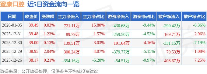 证券之星消息,截至2026年1月5日收盘,登康口腔(001328)报收于39.49元,上涨0.03%,换手率2.7%,成交量1.16万手,成交额4564.72万元。