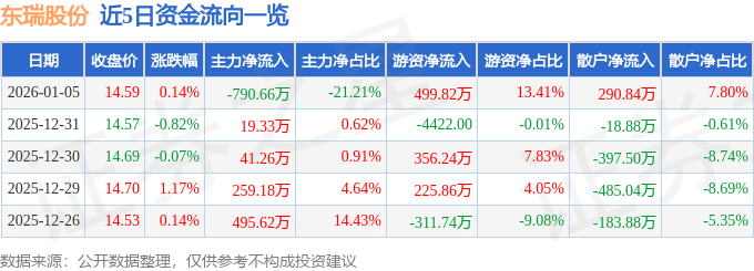 证券之星消息,截至2026年1月5日收盘,东瑞股份(001201)报收于14.59元,上涨0.14%,换手率1.26%,成交量2.56万手,成交额3727.77万元。